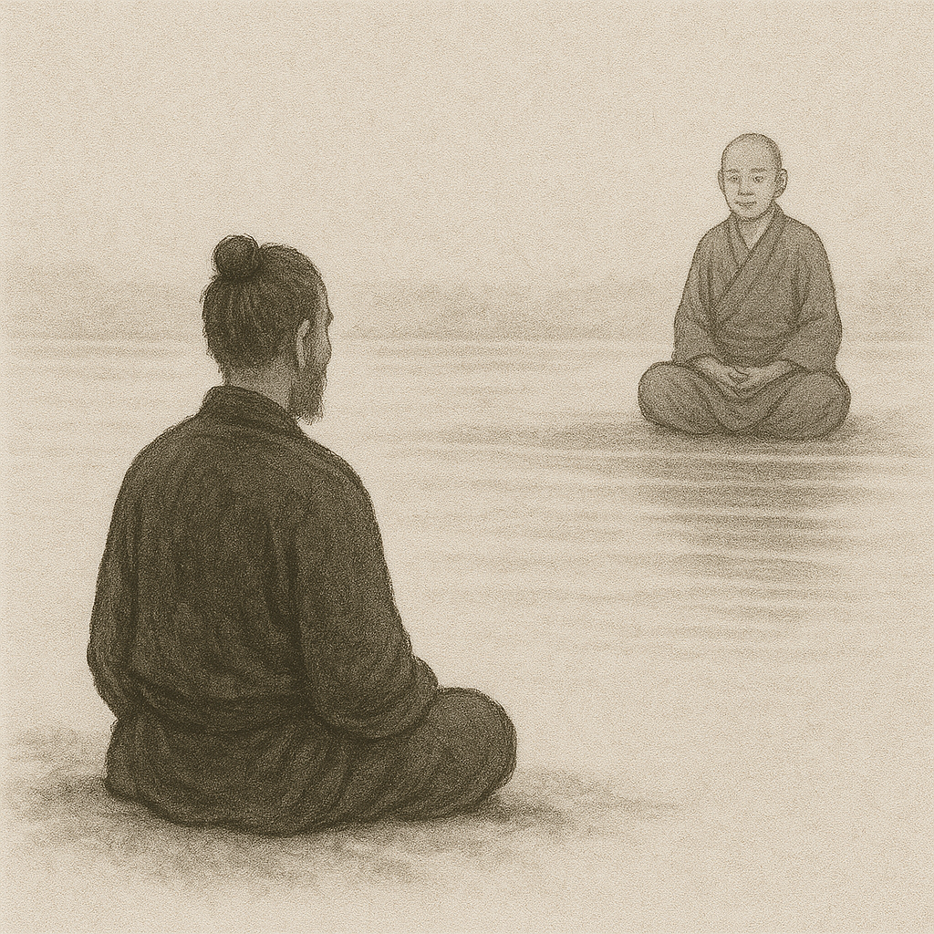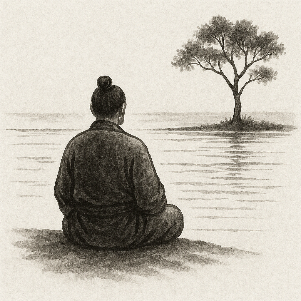 Vid dess kant satt mästaren, tyst, med ryggen vänd mot världen men ansiktet vänt mot alltet.
